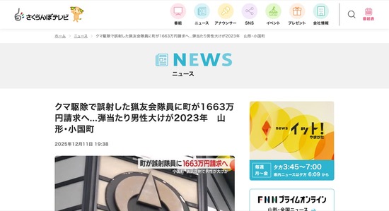 【山形】クマ駆除の誤射で男性大けが、猟友会隊員に町が1663万円請求へ