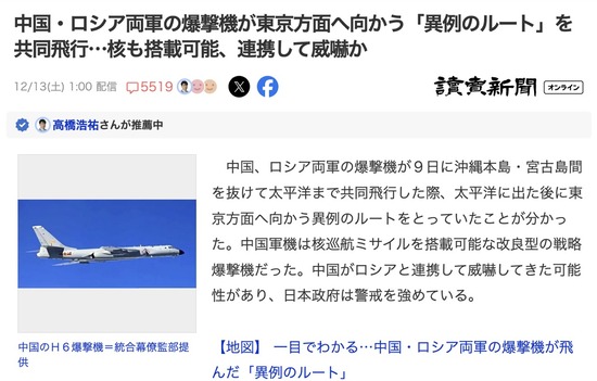 【悲報】中国軍、ロシア軍と一緒に核搭載可能な爆撃機で東京方面に威嚇飛行
