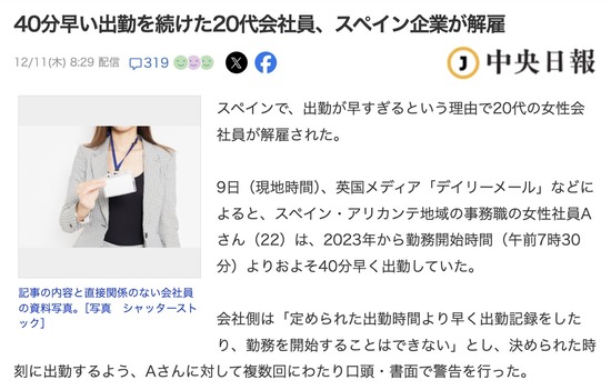 スペイン企業、毎朝40分早く出勤していた社員をクビにする