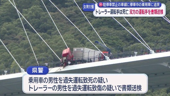 【悲報】駐停車禁止の女神大橋にアホが深夜ライト消して停車し彼女に電話→トレーラーがぶつかり運転していた男性が65m下に転落し死亡→アホと一緒に運転手男性も書類送検される…