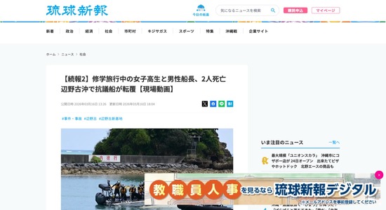 【悲報】辺野古で抗議船が転覆、船長と修学旅行の女子高生が死亡