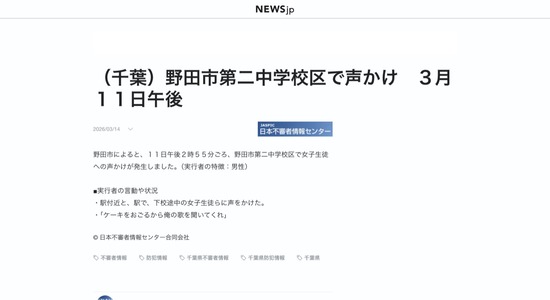 【不審者】「ケーキをおごるから俺の歌を聞いてくれ」下校中の女子生徒への声かけが発生