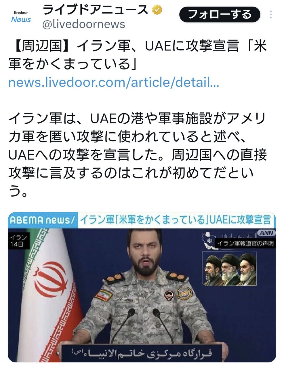 イラン軍、UAEに攻撃宣言「米軍をかくまっている」